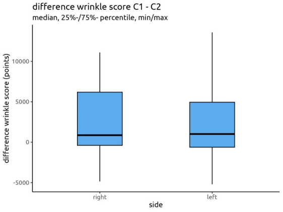When looking at the medians of the data, a different picture emerges compared to the means. The median absolute wrinkle score for the right side reduced from 29,387 at C1 to 29,345 at C2, a total reduction of 42 points. For the left side, the median reduced from 32,624 at C1 to 28,678 at C2, a total reduction of 3,946 points.