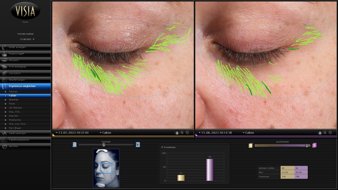 Wrinkles are creases, furrows, or folds in the skin that increase with age, through muscular activity, as a result of sun exposure, or due to bad habits, such as smoking. The Visia® camera detects wrinkles by their characteristic long and narrow shape. Interestingly, previous research has noted that the Visia® camera can visualize wrinkles that cannot be seen by the naked human eye [8].