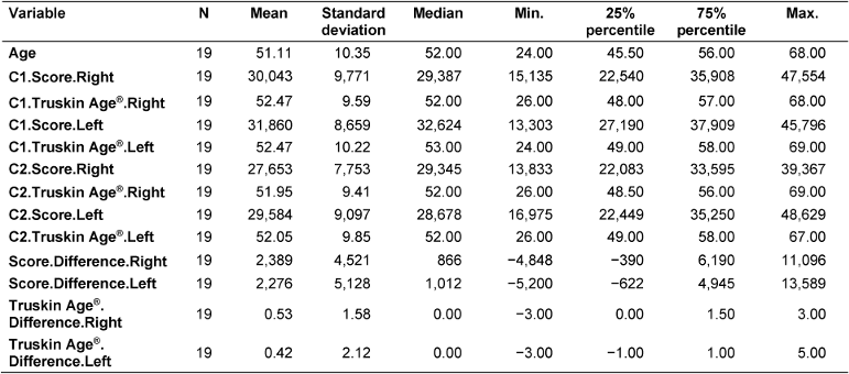 A statistical comparison between C1 and C2 was conducted in terms of the absolute wrinkle scores and Truskin Ages® was conducted for both facial sides (Table 4 [Tab. 4]).