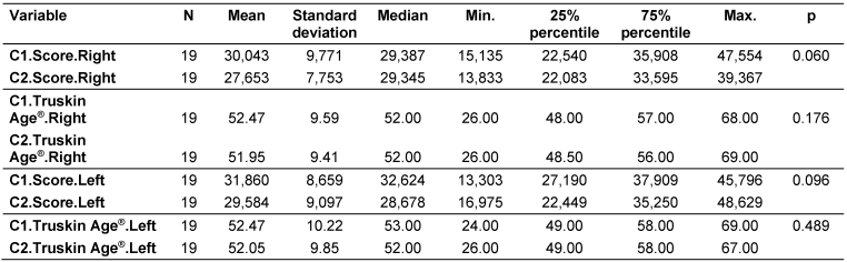 The Wilcoxon matched pairs test was used for intra-individual comparisons, such as those between the two time points (C1 and C2), as well as for comparisons between both sides of the face (right and left) [9]. Statistical analyses were conducted using the BiAS program for Windows [10]. A p-value smaller than 5% (p<0.05) was considered statistically significant.