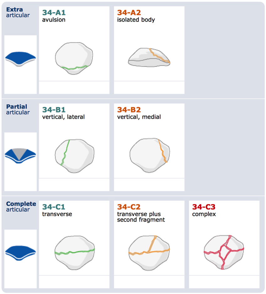 The AO (Arbeitsgemeinschaft für Osteosynthesefragen) – ASIF (Association for the Study of Internal Fixation) has advocated a classification – (Figure 1 [Fig. 1]) based on the principles of the classification of long bone fractures as published by Müller et al. [60].