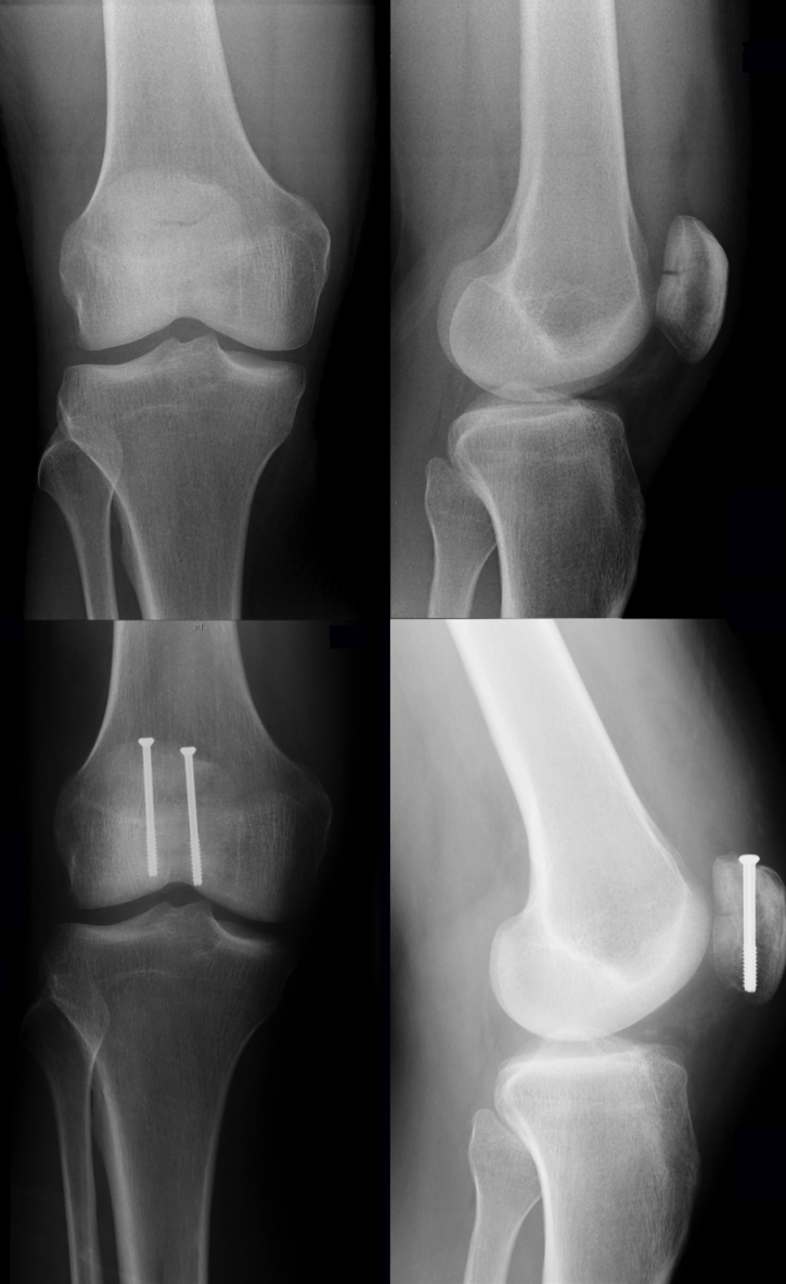 Figure 5: Preoperative X-rays of a non-comminuted transverse patella fracture (above). 3 months post-surgery using percutaneous screw fixation (below).