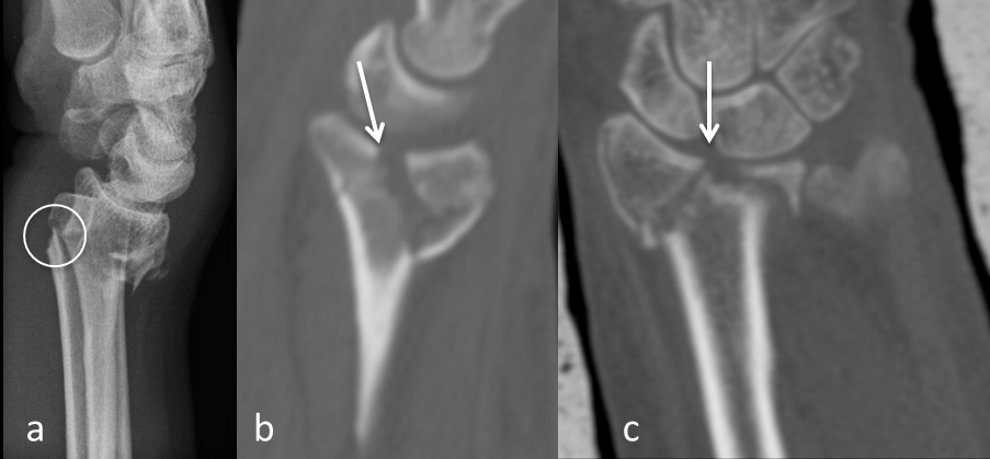 Figure 1: a: The parameter displaced palmar cortex in a conventional sagittal radiograph (circle). b: The parameter displaced frontal split in a sagittal plane of a CT-scan (arrow). c: The parameter displaced sagittal split in a frontal plane of a CT-scan (arrow). The main parameters of the heuristic.