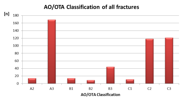 The majority of patients were women (289 women and 187 men) with a mean age of 57.1 years (standard deviation (SD) 18.6 years, range 16–95 years) in our collective. In 289 cases the left side was fractured, in 211 the right, and in 24 both sides. The results of the AO/OTA classification are provided in Figure 2 [Fig. 2].