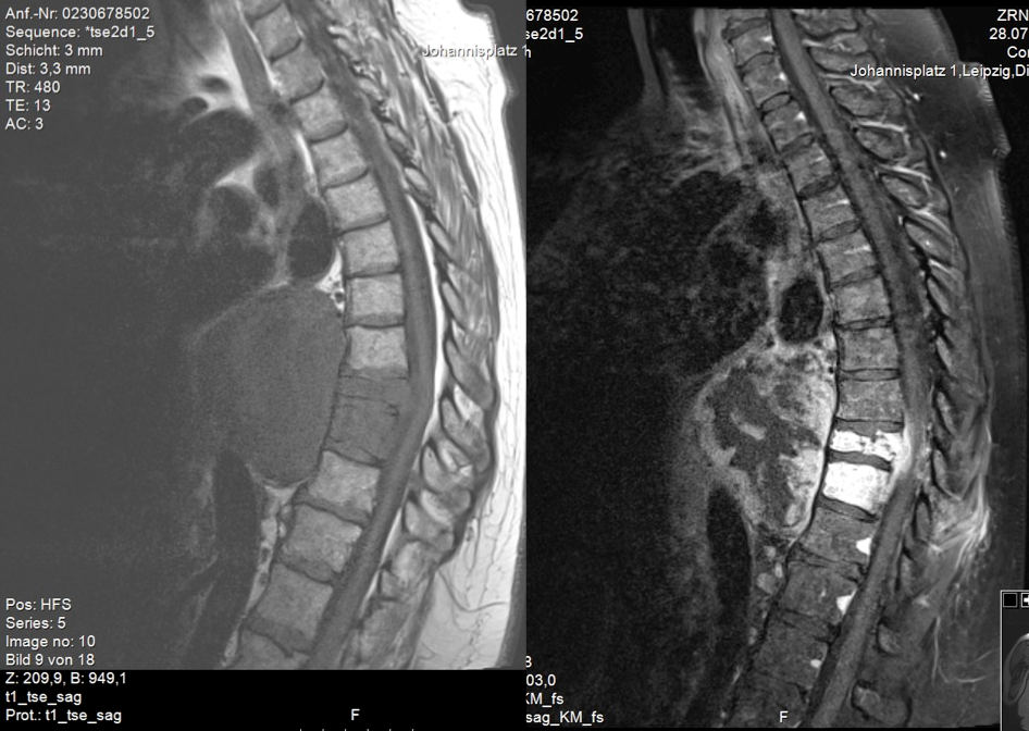 Figure 1: Sagittal MR image of the thoracic spine. Left: T1-weighted image. The tumor represents as a hypointense mass infiltrating the spine with spinal canal penetration. Right: T1-weighted, contrast enhanced image. Inhomogeneous gadolinium distribution.