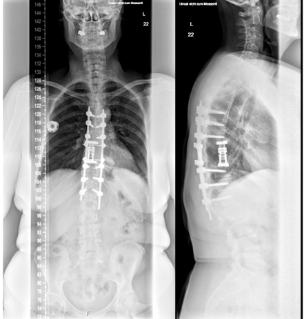 Figure 5: Postoperative X-ray (a.p. and lateral view). Posterior long segment pedicle screw stabilization and anterior reconstruction via expandable cage.