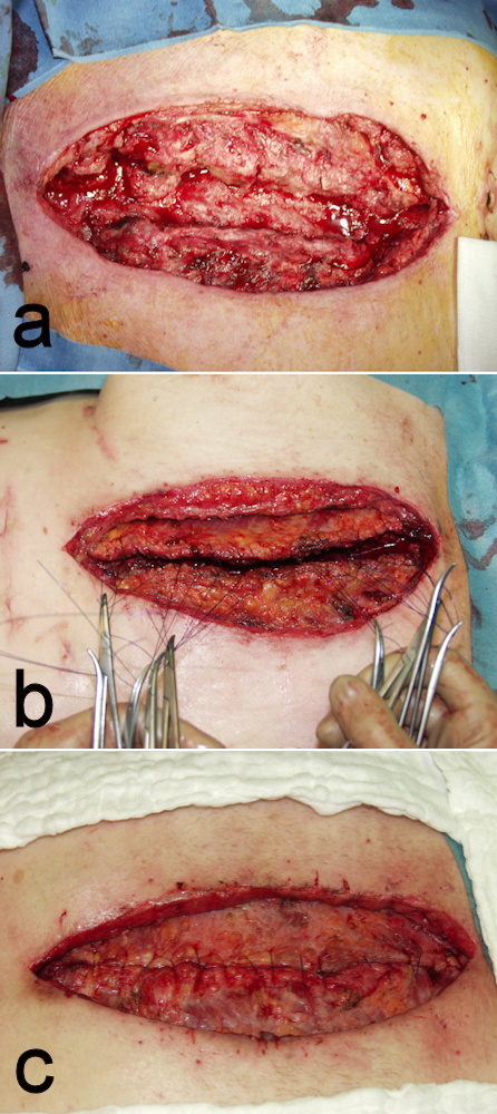 Abbildung 3: a: Nach Debridement; b: M. Pectoralisplastik; c: M. Pectoralisplastik fertiggestellt
