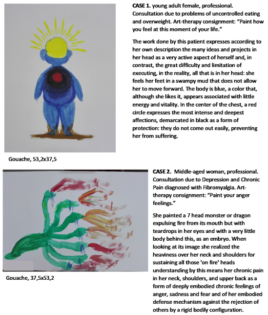 Thus, it is through the creative process (with its rhythms, pulses, movements, vitality, energy, stiffness, looseness or fluidity, space use, etc.), that these images emerge, capturing on the blank page this pre-reflective and sensorimotor process resulting in an artwork as a concrete metaphor of embodied meanings. It is expressed in Figure 2 [Fig. 2] as follows: In case one the lack of vitality and energy, the lack of connection with the body and emotions, the lack of agency and sense of ownership over one’s own body as an active agent on the environment. In case two the bodily configuration of feelings of rage as a defense against the emotional fragility of the patient expressed in overexertion of the neck and shoulders to hold a flaming head that expresses, in turn, the painful points of her fibromyalgia.