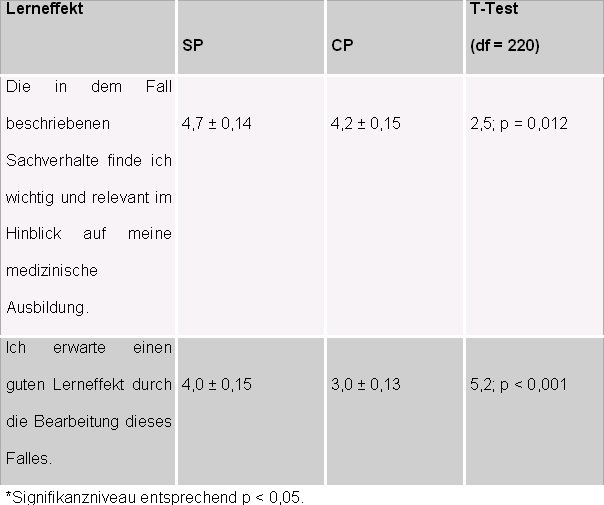 Der erwartete Lerneffekt durch das Kommunikationstraining mit Standardisierten Patienten wurde signifikant höher eingeschätzt als der erwartete Lerneffekt durch die Bearbeitung eines Patientenfalles anhand computerbasierter Fallsimulation. Auch die Relevanz der in dem jeweiligen Fall beschriebenen Sachverhalte im Hinblick auf die medizinische Ausbildung wurde beim Unterricht mit Standardisierten Patienten signifikant höher eingestuft (siehe Tabelle 2 [Tab. 2]).