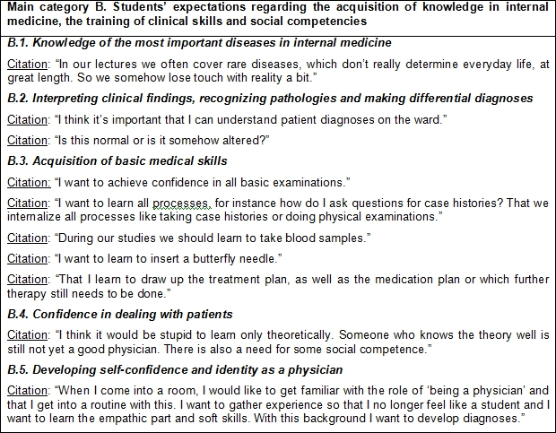 Table 2: Examples of students’ citations for the main category A. - B. Students’ expectations regarding the acquisition of knowledge in internal medicine, the training of clinical skills and social competencies (see table 3 [Tab. 3])