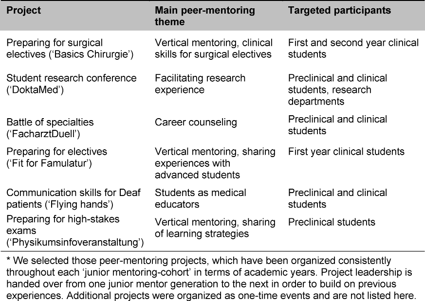 The peer-mentoring program was initially designed primarily for pre-clinical students but students from clinical semesters regularly participated in most peer-mentoring events as well. The driving momentum of the peer-mentoring program originates from motivated students from all semesters, so called junior mentors. The individual junior mentors are selected through a democratic selection process.
