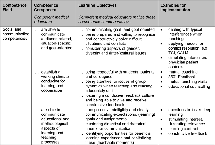 The complete model “core competencies for medical teachers” with all competency fields, competence components, learning objectives and examples is enclosed in the attachment [Att. 1].