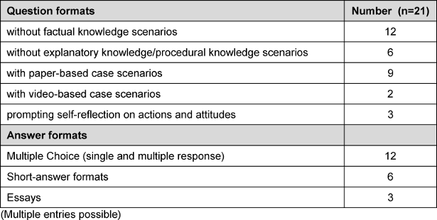 For ten of the twelve programmes reporting summative evaluations, it was indicated that the paper-based and computer-based evaluation of communicative competencies that were relevant to passing were administered in combination tests (i.e., together with other formats or competencies). Pure communication tests were indicated for six programmes. Predominantly multiple choice questions were used, testing only factual knowledge. Table 8 [Tab. 8] details question types/stimuli and answer formats as well as the number of entries.