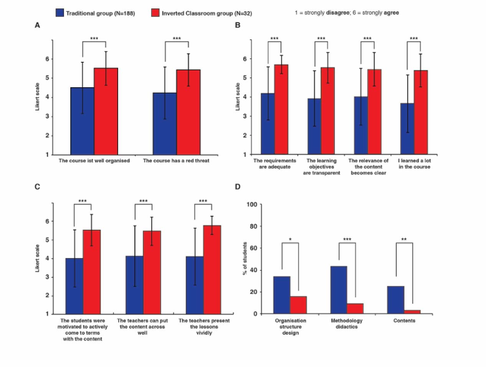 When asked about the need for optimisation, the difference between students from the traditional and the IC group became very clear. Special emphasis should be made of the item “Methodology and didactics”. Whereas 43% of students from the traditional group saw a need for improvement here, the figure was only 9% for students from the IC group (see Figure 2 [Fig. 2], Point D).