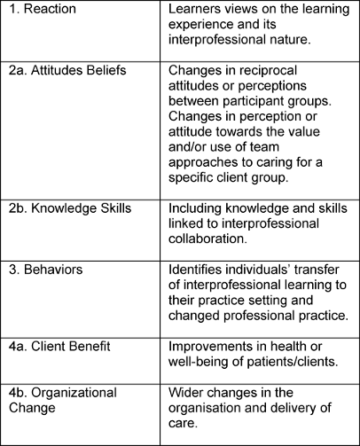 [1] Barr H, Freeth D, Hammick M, Koppel I, Reeves S. Evaluations of interprofessional education. London: United Kingdom Review of Health and Social Care; 2000.[2] Blue AV, Chesluk BJ, Conforti LN, Holmboe ES. Assessment and Evaluation in Interprofessional Education: Exploring the Field. J Allied Health. 2015;44(2):73-82.