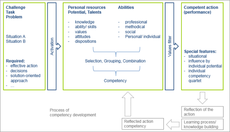 Other people’s behaviour is regarded as competent when the behaviour they display is judged by a third party to be “effective”. Competency building essentially comprises the internalisation of values. Through processes of reflecting on one’s own role and the role of others, values, norms and rules of individual and social action within the context of the situation are analysed and evaluated. Coaching by colleagues, assessment and feedback discussions, fireside evenings with managers and heads of staff, projects for shaping the future, project work or quality circles in the form of specialised group meetings, are all imperative for successful development. As a basis for action, the reflection result is subordinate to subsequent actions; situational actions are varied if necessary using the options for action identified within reflection.