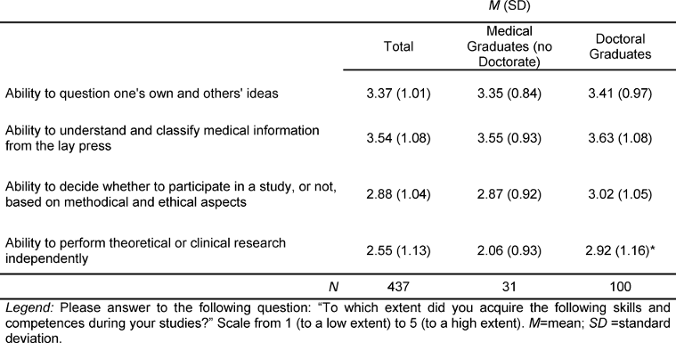 The items referring to the medical curriculum were analysed for the total sample, the acquired research competences and the ability to act evidence-based in the professional world were analysed by doctoral status(doctoral graduates vs. no doctoral graduates).