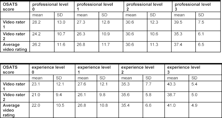 In the current pilot study, we evaluated the modified OSATS for chest tube insertion regarding it’s criterion validity for its use in blinded video rating. Video rating, instead of on-site direct rating, was used due to its ability to eliminate confounding factors such as age or formal professional level of the participants. Our results suggest that the OSATS was apt to standardize expert rating and could be used to depict and measure differences in skill between experience levels of surgeons, residents, and medical students. According to our results the OSATS tool is not biased by confounding factors like age or formal professional level, but reflects procedural experience only.