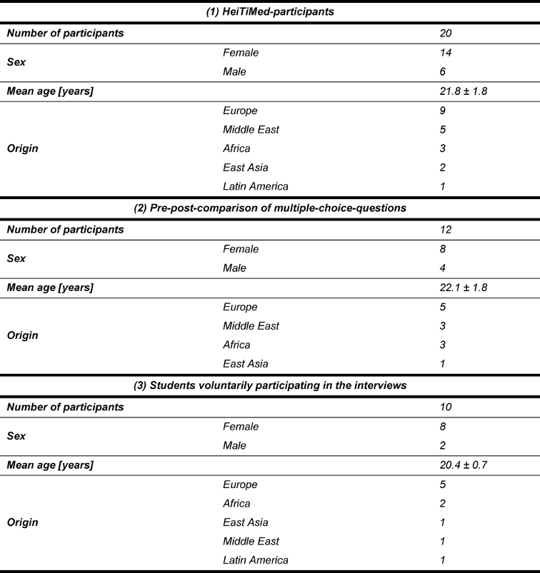 The international students at the Heidelberg University Medical Faculty were informed in the second semester of their first year about the continuation of the tutorial for the third semester. Tutorials were voluntary and open for all international students. A detailed description of the participants will be presented in the results section.