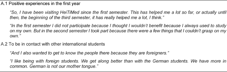 The category describes different motives among international students that prompted them to participate in the course and includes two relevant themes. The theme “Positive experiences in the first year” (A.1) contains students’ statements about very helpful experiences with the tutorial already in their first year of studies. In most cases they did not really have to decide whether to attend the course or not since they already had got used to going there. “To be in contact with other international students” (A.2) envelopes the idea of coming into contact with other international students in a similar situation. For more details see Table 4 [Tab. 4].