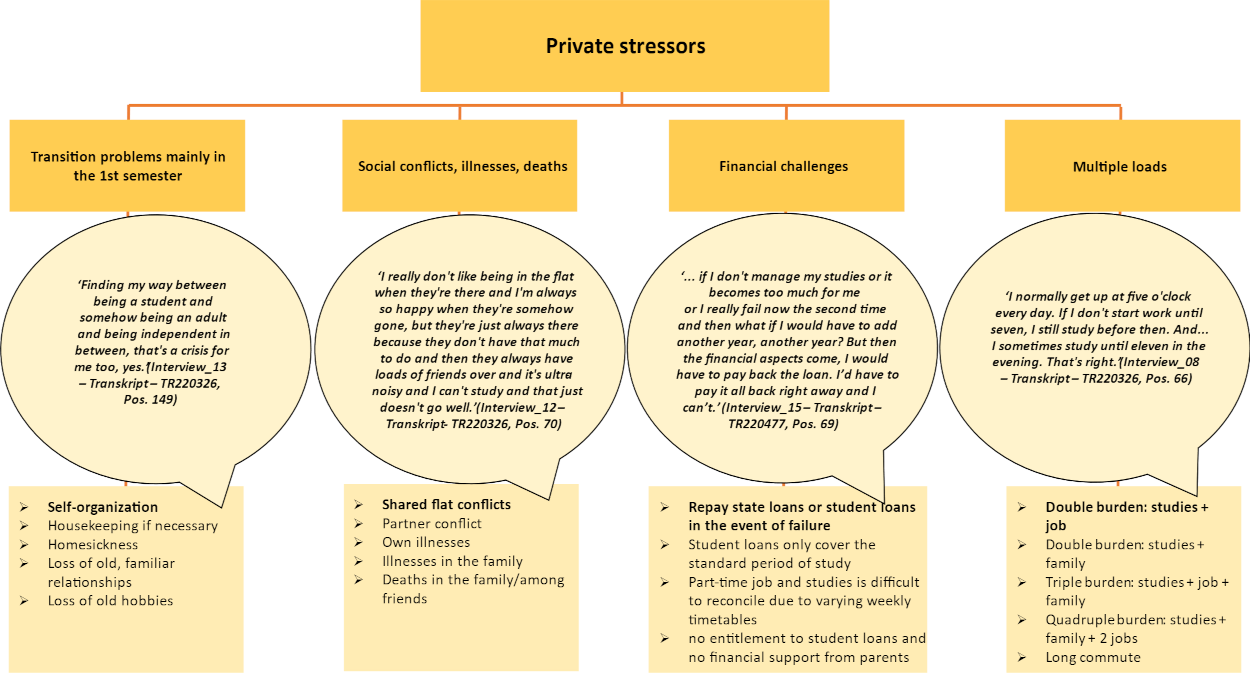 Transition problems, especially in the first semester, social conflicts, financial challenges and multiple loads were mentioned here (see figure 3 [Fig. 3]).
