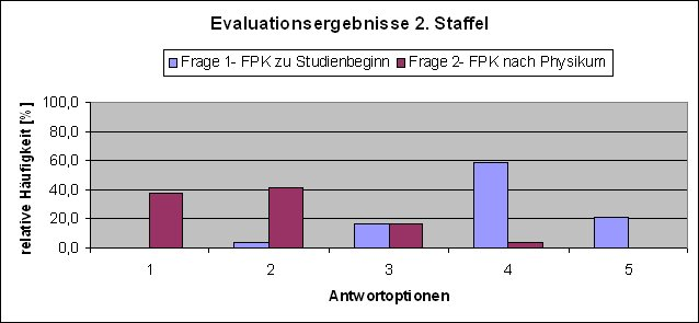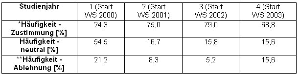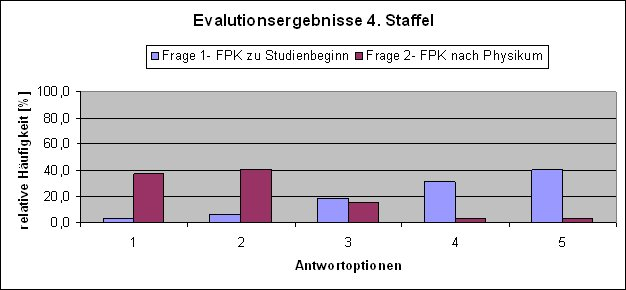 Die Zielrichtung der Evaluationsmaßnahme ist praxisorientiert, d.h. die Bewertung des Projekts steht im Vordergrund [10]. Derzeit liegen die Ergebnisse von vier aufeinander folgenden Studienjahren vor. Da in diesem Beitrag vorrangig das Lehrkonzept dargestellt werden soll, stellte sich die grundsätzliche Frage, ob ein solches fakultatives Lehrangebot von den Studierenden angenommen wird. Daher wurden exemplarisch zwei Fragen aus den Abschlussbewertungsbögen der vier Studienjahre (Frage 1: Ich befürworte den FPK am Anfang des zahnmedizinischen Studiums, Frage 2: Der FPK in der Zahnmedizin ist erst nach dem Physikum sinnvoll.) zur graphischen Darstellung ausgewählt. Die statistische Auswertung wurde als deskriptive Statistik mit dem SPSS- Programm (Statistical Package for Social Science) vorgenommen. Das gewählte Verfahren stellt eine geschlossene, summative Evaluation des Projektes dar.