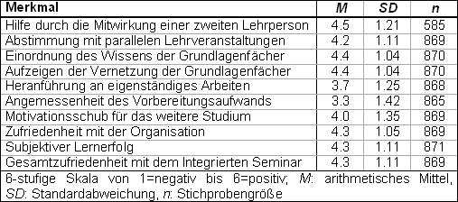 Für die Abschlussevaluation liegen die Ergebnisse aus insgesamt vier Erhebungen vor. Im ersten bis dritten Semester evaluierten die Studierenden die Veranstaltung rückblickend am jeweils letzten Seminartermin. Hier fiel der Rücklauf mit 89% (n=345), 76% (n=287) bzw. 80% (n=296) sehr zufriedenstellend aus. Da der kurzfristige Ausfall des letzten Seminartermins im vierten Semester eine methodisch konsistente Durchführung der Abschlussevaluation verhinderte, erfolgte die Evaluation des Integrierten Seminars im Rahmen der allgemeinen Semesterabschlussevaluation, bei der die Studierenden die Pflichtveranstaltungen sämtlicher Fächer des Semesters anhand eines einzelnen Fragebogens beurteilten. Dieses Vorgehen stellt eine methodisch grundlegend andere und damit letztlich nicht vergleichbare Art der Datenerhebung dar. Darüber hinaus wurde bei dieser Befragung wegen organisatorischer Probleme ein Rücklauf von nur 32% (n=116) erzielt. Vor diesem Hintergrund werden nachfolgend nur die Resultate der Abschlussevaluationen aus den ersten drei Semestern dargestellt.