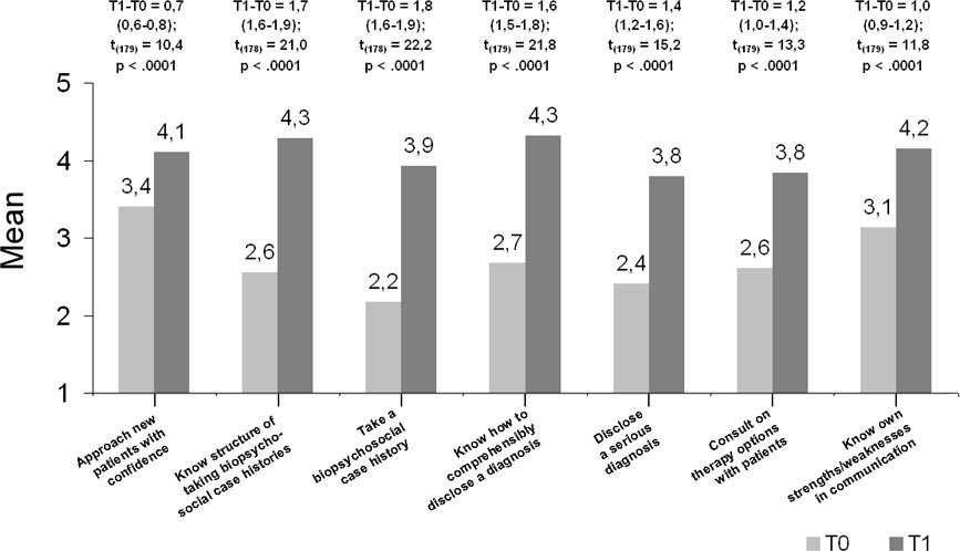 The highest learning needs were found for the “to show how”-items regarding history taking and disclosing diagnoses (M=4.4). The T1-T0 comparisons showed the greatest improvements for history taking (“to know how”: mean difference = +1.7, “to show how”: +1.8, p<.0001 as with all tests) and the “to know how”-item regarding the disclosure of diagnoses (+1.6), followed by the “to show how”-items on disclosing a diagnosis (+1.4), shared decision making (+1.2), self-assessing one’s own strengths/weaknesses (+1.0) and confidently approaching new patients (+0.7). Students with T0 values of 1 or 2 on the respective scales improved on average by 2.2 points across all items, students with the value of 3 by 1.1, and from 4 or 5 by 0.1. Methodically, the use of simulated patients was rated the most helpful (M=4.8, 87% with the scale value 5).