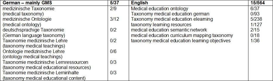 The second step took place in June and July 2011, and involved an expansion of the systematic literature search in Medline http://www.ncbi.nlm.nih.gov/pubmed and in GMS http://www.egms.de/dynamic/de/index.htm, using 7 supplementary English terms. The additional terms searched are summarized in Table 1 [Tab. 1], on the right column. Based on the abstracts of the search results, all publications describing a formal vocabulary related to medical education were selected for further analysis, and the cited taxonomies and ontologies were identified.