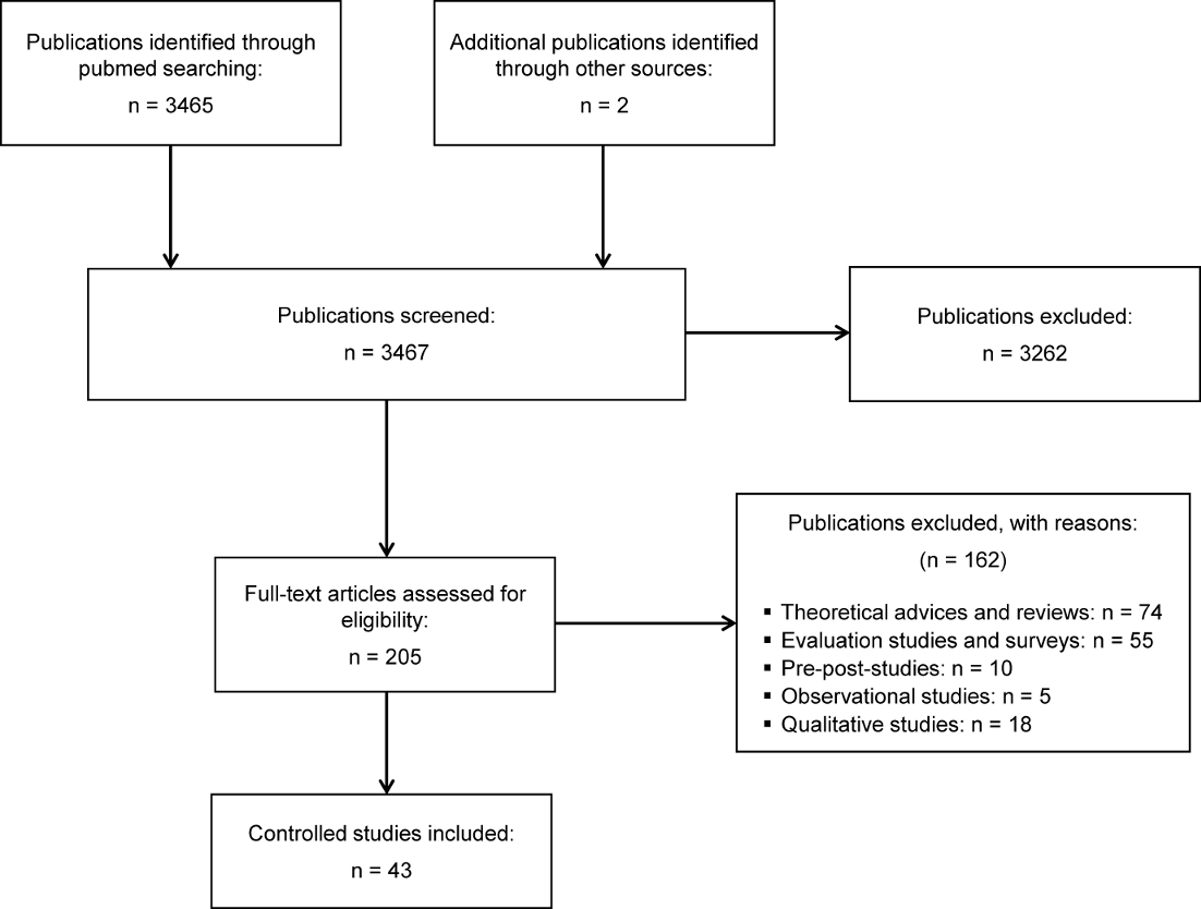 This original compiled search resulted in a total of 3467 publications. For further consideration, only full research articles with undergraduate medical students being the studies’ subjects were included; short papers, letters or comments were excluded. In this step all titles and abstracts were screened and only manuscripts including at least one of the desired basic practical skills were included for further screening, resulting in 205 articles. Duplicates were also excluded in this step. These 205 manuscripts were subdivided in the following categories: controlled studies, theoretical advices and reviews, evaluation studies and surveys, pre-post studies, observational studies, and qualitative studies.