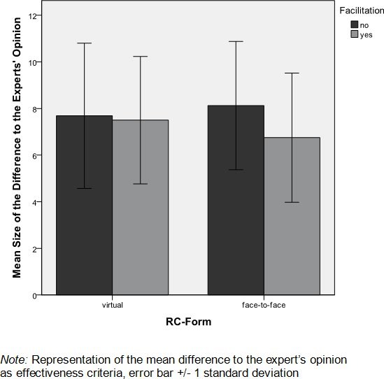 The complete facilitation method which has, as could be demonstrated by Schimansky [10], a superior impact on increasing effectiveness in comparison to partial aspects of the method, was not used in the present study. Another limitating factor is that no trained facilitators were available for this investigation. As can be seen from the literature, professional facilitators proceed more methodically and oriented on tasks than those who perform this role solely casually [11].