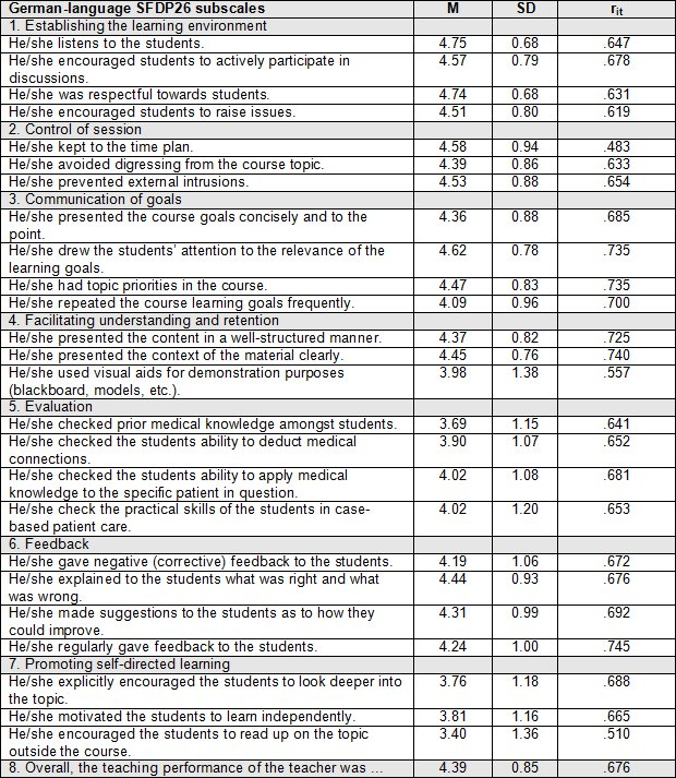 Conclusion: The analysis of SFDP26-German confirms high internal consistency. Future research should investigate the effectiveness of the individual categories on the overall effectiveness of teaching and validate according to external criteria.