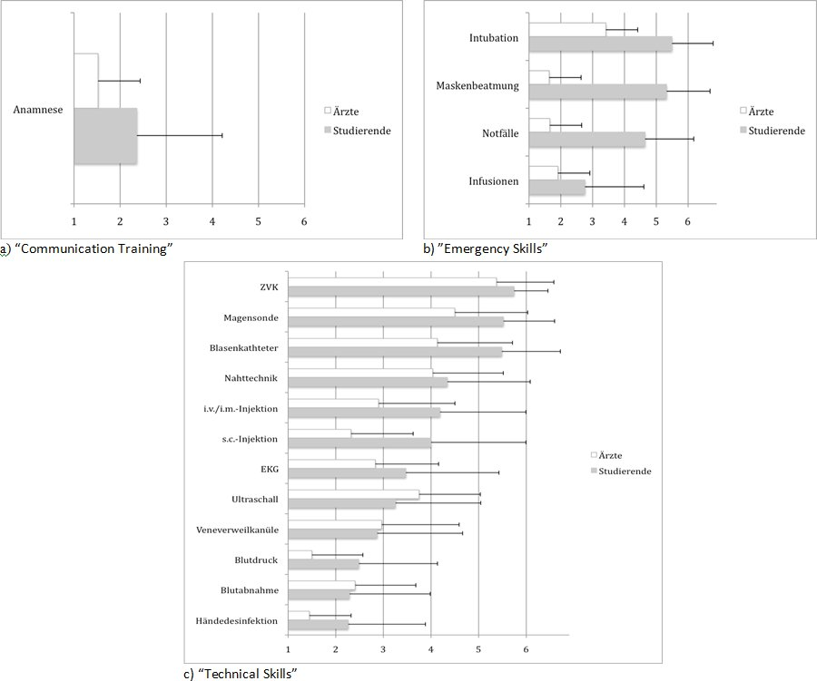 The differences between the rated necessity of the skills in “taking blood samples”, ”iv/im injections” and “suture techniques” between hospital-based staff and GPs is not surprising, given the different fields of activity. Nevertheless, it must be borne in mind that the practical training has to prepare students both for clerkships at a hospital and in GP’s surgery.