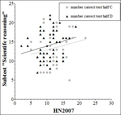 Figure 3: Correlations of the subtest „scientific reasoning“ with the HN2007 test Halves C and D and their respective regression lines.