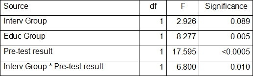 This analysis compares subjects from the intervention group with those in the control group. There was a significant influence by the intervention (yes/no) (p<0.0005). On average, participants in the intervention group attained 23.3, the control group 19.8 points in the post-test, i.e. the null hypothesis of a lack of difference between intervention and control group can be rejected.
