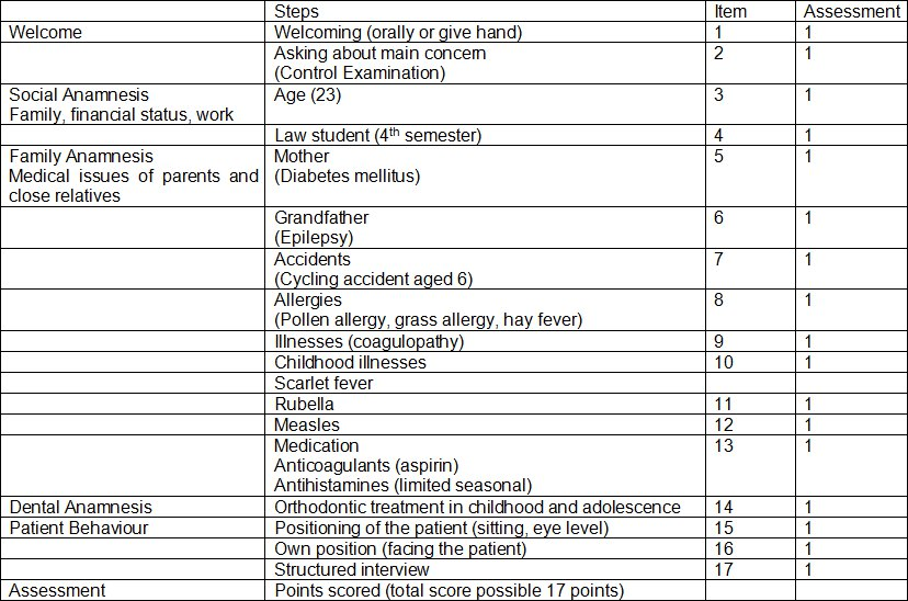 Each of these OSCE stations was assigned a special score sheet with predefined items. The individual testing stations were designed according to the learning objectives of the course Early Patient Contact on the basis of a blueprint [19]. The exam was conducted using two standardised patients (actors). These were professional actors from the Theatre Academy Western Pomerania. Both patients had a pre-determined, identical medical history, which was based on a detailed role script. This script was delivered to the actors in advance. The exam was then simulated at the dental treatment unit with the assistant scientific physician in charge of the OSCE. During this training, the actors were honed to the role script in detail to avoid differences between the examination sessions. In addition, it was ensured that the actors were similar in age, sex, height, weight and oral status.