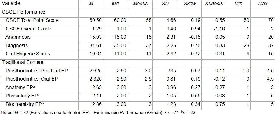 Table 1[Tab. 1] shows the descriptive statistics, which show that the performance of all study participants is in the upper range for all ten indicators. The distribution of the ten variables were tested for normal distribution. For the OSCE total score, overall grade, anamnesis, physiology and biochemistry exam the Kolmogorov-Smirnov test was significant (p<0.05) so we were able to reject the null hypothesis regarding normal distribution. For this reason, the inferential statistical tests were performed using nonparametric methods.