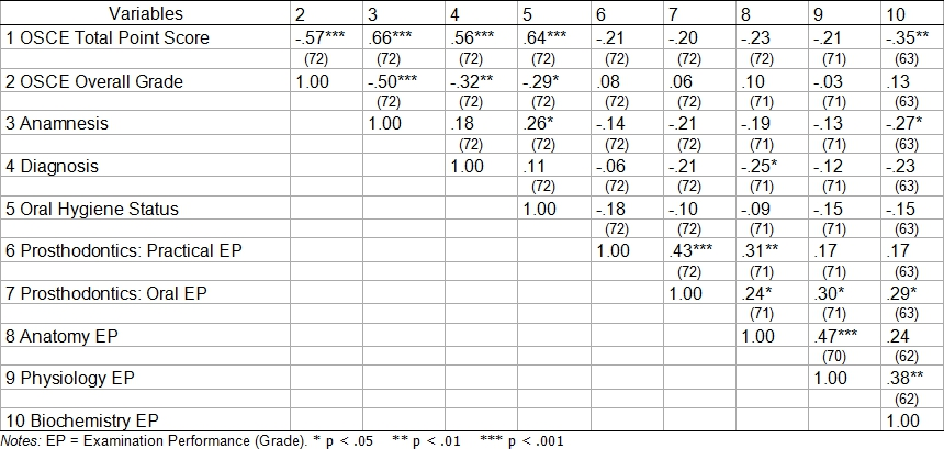 The correlation analyses revealed a correlation between the OSCE stations Anamnesis and Oral Hygiene but not regarding the clinical diagnosis. These results can be explained through the OSCE conduct. During the exam, each examinee had access to the records relating to the clinical findings. Following the patient interview, the diagnosis was completed based on these documents. Identifying the diagnosis in this case depended less on the communicative ability possibly more on learned knowledge. In contrast, taking an anamnesis and the oral hygiene status as part of the patient interviews relies on communicative skills. A systematic relationship between OSCE performance and the traditional subjects of anatomy and biochemistry was also found. While the performance in biochemistry is likely to be a chance finding, the link between anatomy and the clinical diagnosis could be explained through the content overlap. The anatomical structures of the oral cavity are discussed in detail in the microscopic and macroscopic anatomy course. Knowledge of the constituents and labels of oral structures from the anatomy course could facilitate the conducting an anamnesis and thus explain this relationship.