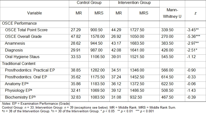 • Hypothesis 1: In comparison with the control group, the intervention group will score higher in the OSCE overall in conducting an anamnesis, dental diagnostic findings and the oral hygiene status.