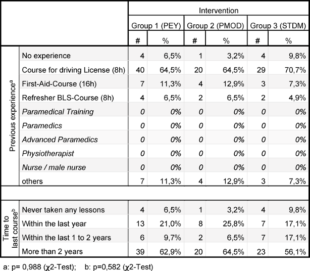 2 Prior experience: first aid course at some point during the last two years, apprenticeship as paramedic, physiotherapist, nurse, in emergency rescue services