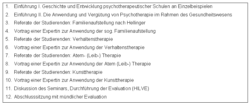 Für den Entwurf eines Seminars zu den im Folgenden näher erläuterten Inhalten gab es mehrere Gründe. Vordringlich war zunächst der Eindruck bei beiden Lehrenden, dass einerseits bei einem Großteil ärztlich bzw. medizinisch Tätiger das Wissen zu aktuellen Fragen, zu Indikation, Nutzen und Möglichkeiten von Psychotherapieformen nur gering vorhanden ist, andererseits das Interesse an diesen Aspekten in der Bevölkerung, also bei den potentiellen Nutzern dieser Therapieangebote, sehr hoch ist bzw. die Anwendung dieser Therapieformen im Rahmen des Gesundheitswesens einen, auch ökonomisch gesehen, nicht unbeträchtlichen Faktor darstellt. Eine Vortragsreihe in einem rein medizinhistorisch ausgerichteten Seminar hatte während der Vorbereitungszeit zum hier vorgestellten Seminar bereits deutlich gemacht, dass bei Studierenden, jedoch darüber hinaus auch bei bereits in nervenheilkundlichen Arbeitsfeldern Praktizierenden ein hohes Interesse an der Geschichte wie auch an aktuellen Aspekten verschiedener Psychotherapieformen besteht. Die Umsetzung dieses Seminars im Rahmen des Wahlpflicht-Unterrichts im Reformstudiengang Medizin an der Berliner Charité stellt darüber hinaus auch den Versuch dar, Ergebnisse aktueller Forschungsprojekte der Autoren in den Unterricht zu integrieren [11], und belegt unserer Ansicht nach, dass aktuelle Forschung und Lehre sich gut verbinden lassen. Im Folgenden wird zunächst die Struktur des Seminars vorgestellt.