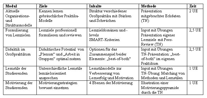 Für den Workshop "Großpraktika effizient gestalten - Stärken der Veranstaltungsform nutzen, Schwächen kompensieren" erfolgte zunächst eine Abstimmung der Ziele und Inhalte zwischen den Moderatoren und Vertretern der Zielgruppe. Ergebnis war ein Konzept aus 5 "Modulen" (siehe Tabelle 1 [Tab. 1]). Alle 5 Module werden auch in der Literatur als wichtige Items gerankt [17]. Die Gesamtstundenzahl wurde auf 9 UE konzipiert.