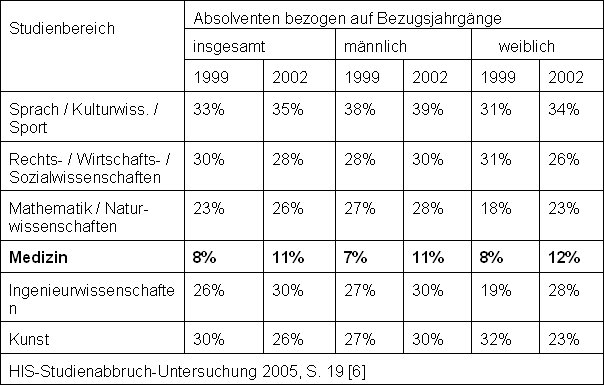 Das Medizinstudium hat traditionell die geringsten Studienabbruchquoten, wofür nach den Recherchen des HIS "Zulassungsbeschränkungen, transparente Studienstrukturen, hohe Studienmotivation und klare Berufsvorstellungen“ beitragen [5]. Demgegenüber scheinen sich „die Enttäuschungen im Studium über Studieninhalte, berufliche Möglichkeiten und auch über das eigene Leistungsvermögen ... in bestimmten Grenzen zu halten“ (S. 20). Auffallend ist eine Steigerung der Studienabbruchquote von 8 auf 11%, die im Kontext der aktuellen Deprofessionalisierungsdiskussion interpretiert werden könnte.