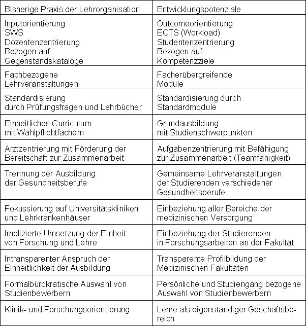 Aufbauend auf den vielfältigen Bemühungen zur Reform der ärztlichen Ausbildung und den Erkenntnissen im Kontext des Bologna-Prozesses bieten sich für die Medizinischen Fakultäten im Rahmen der geltenden Approbationsordnung Möglichkeiten zur Qualitätsentwicklung (siehe Tabelle 7 [Tab. 7]).