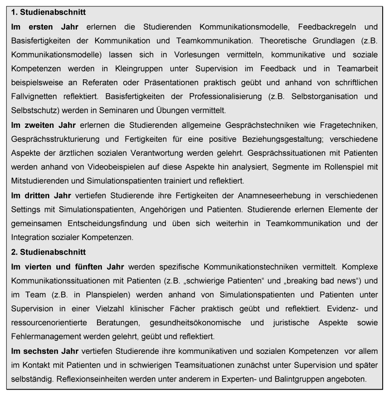 Aus dem englischen Sprachraum liegen verschiedene Consensus Statements zur Vermittlung kommunikativer und sozialer Kompetenzen vor, dennoch gibt es bisher keine fakultätsübergreifenden Empfehlungen für ein Longitudinal-Curriculum. Aus diesem Grund ist ein Vergleich mit Vorschlägen aus anderen Ländern derzeit noch nicht möglich.