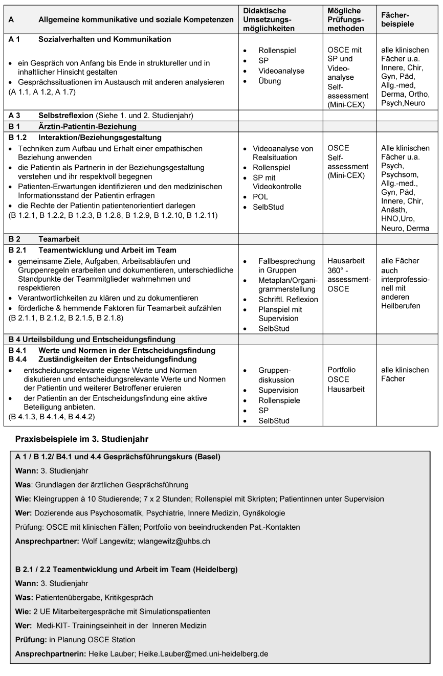 Ziel des Beitrags ist es, ein longitudinales Modell-Curriculum zur Vermittlung kommunikativer und sozialer Kompetenzen vorzustellen. Das Curriculum bietet neben der longitudinalen Zuordnung der Ausbildungsziele des „Basler Consensus Statements“ auf die Studienjahre 1 bis 6 auch didaktische Umsetzungsideen und Prüfungsvorschläge sowie eine Zuordnung zu Fächern, die diese Ausbildungsziele lehren könnten.