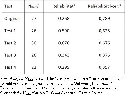 The reliabilities of the respective tests which were modified by the RCs improve in comparison to the original test (see table 1 [Tab. 1]). Two of four tests show relevant higher reliability.