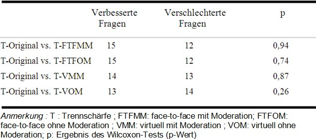 The teamwork was evaluated by means of an analysis of variance (ANOVA) for repeated measurements which was calculated for the difference values between the group’s and expert’s opinion. Additionally to the test statistic and the p-value the effect size is indicated as η2. According to Cohen [5], an effect size from η2=0.0099 is a small effect, from η2=0.0588 is a medium effect and from η2=0.1379 is a large effect. The processing times of the virtual test conditions were evaluated by means of the Wilcoxon signed-rank test due to the non-existing normal distribution of the variable without facilitation. With the data collected for the aspects taking over responsibility, approach to work, motivation, sense of well-being, and concentration on the task, an analysis of variance by ranks for dependent samples according to Friedman was computed with the respective group means. The coefficients of item discrimination of the original questions collected in the second part of the investigation (point-bi-serial correlation coefficient with part-whole-correction) and of the modified questions collected in the modified test conditions were compared by means of the Wilcoxon rank-sum test. Differences were considered to be statistically significant with p≤0.05. All data were analyzed with the SPSS statistics software 15.0.