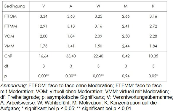 The ranking of the test conditions shown by the Friedman test is identical for the investigated aspects taking over responsibility, approach to work, sense of well-being, motivation and concentration on the task (see table 3 [Tab. 3]). The condition face-to-face without facilitation reaches the highest scores in each case. This is followed by the conditions face-to-face with facilitation and virtual without facilitation. The virtual facilitated condition reaches the lowest score in each case. The differences between the test conditions are statistically relevant for all aspects except motivation.