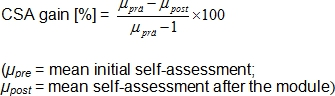 - Performance gain evaluation using comparative self-assessments (CSA): The novel tool used in this study calculates performance gain for specific learning objectives on the basis of repeated student self-assessments. At the beginning of each module, students are asked in an online survey to self-rate their performance levels regarding specific learning objectives (e.g. “I can interpret an electrocardiogram.”) on a six-point scale anchored by “fully agree” (1) and “completely disagree” (6). Self-ratings were again obtained at the end of each module. The percent CSA gain for a specific learning objective was calculated by dividing the difference of mean values (pre-post) by the corrected mean of initial self-ratings across student cohorts according to the following formula (see figure 1 [Fig. 1]):